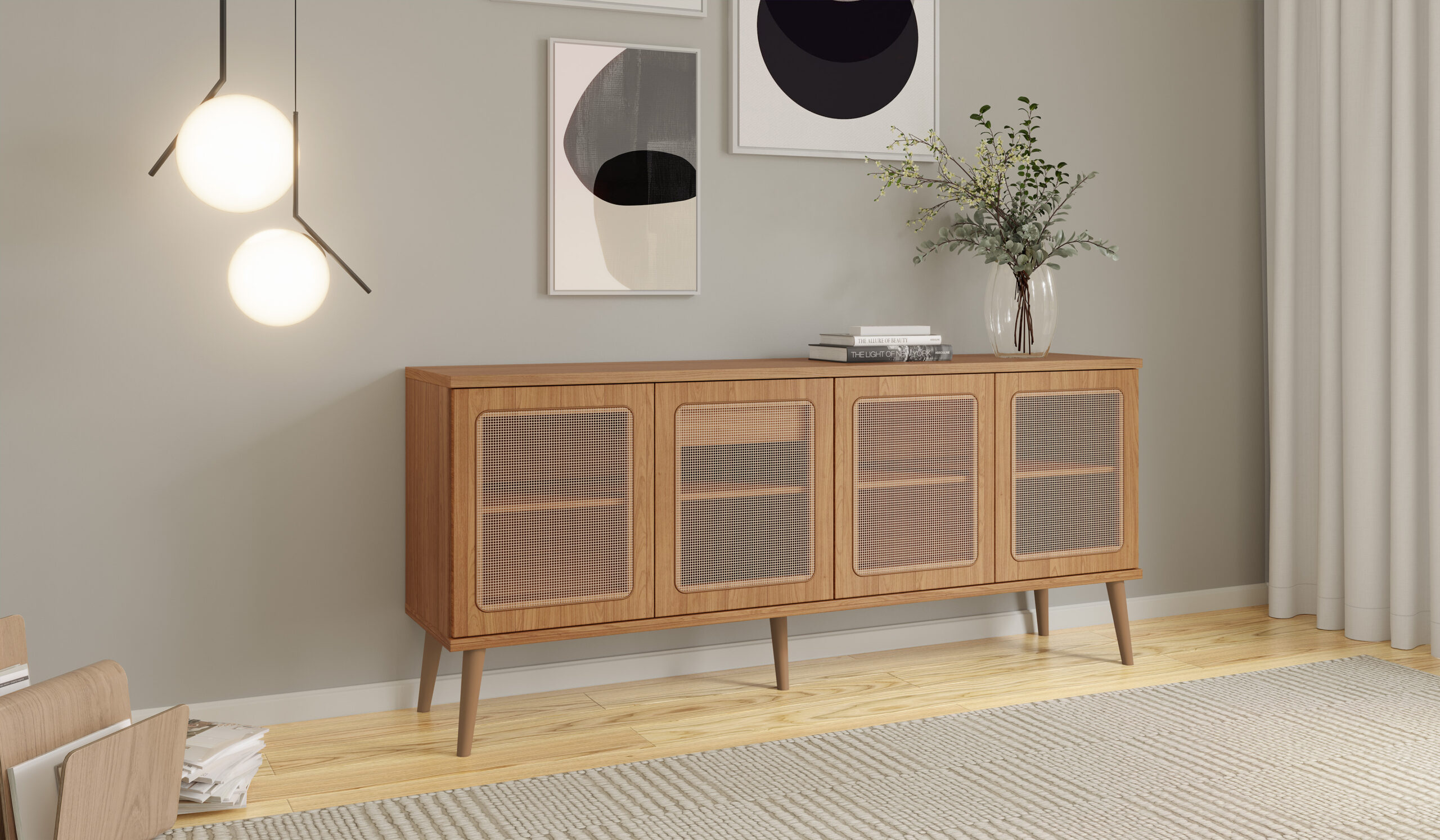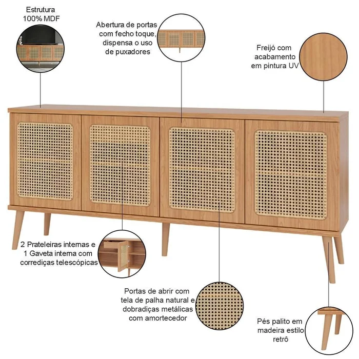 Um buffet encantador que une estética artesanal, funcionalidade e acabamento premium. Ideal para quem deseja sofisticação e leveza no ambiente com o toque natural da tela sintética!