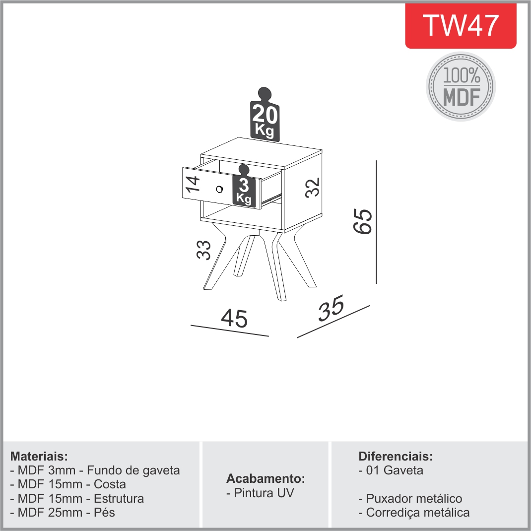 DIMENSÕES: Alt.: 65 cm | Larg.: 45 cm | Prof.: 35 cm