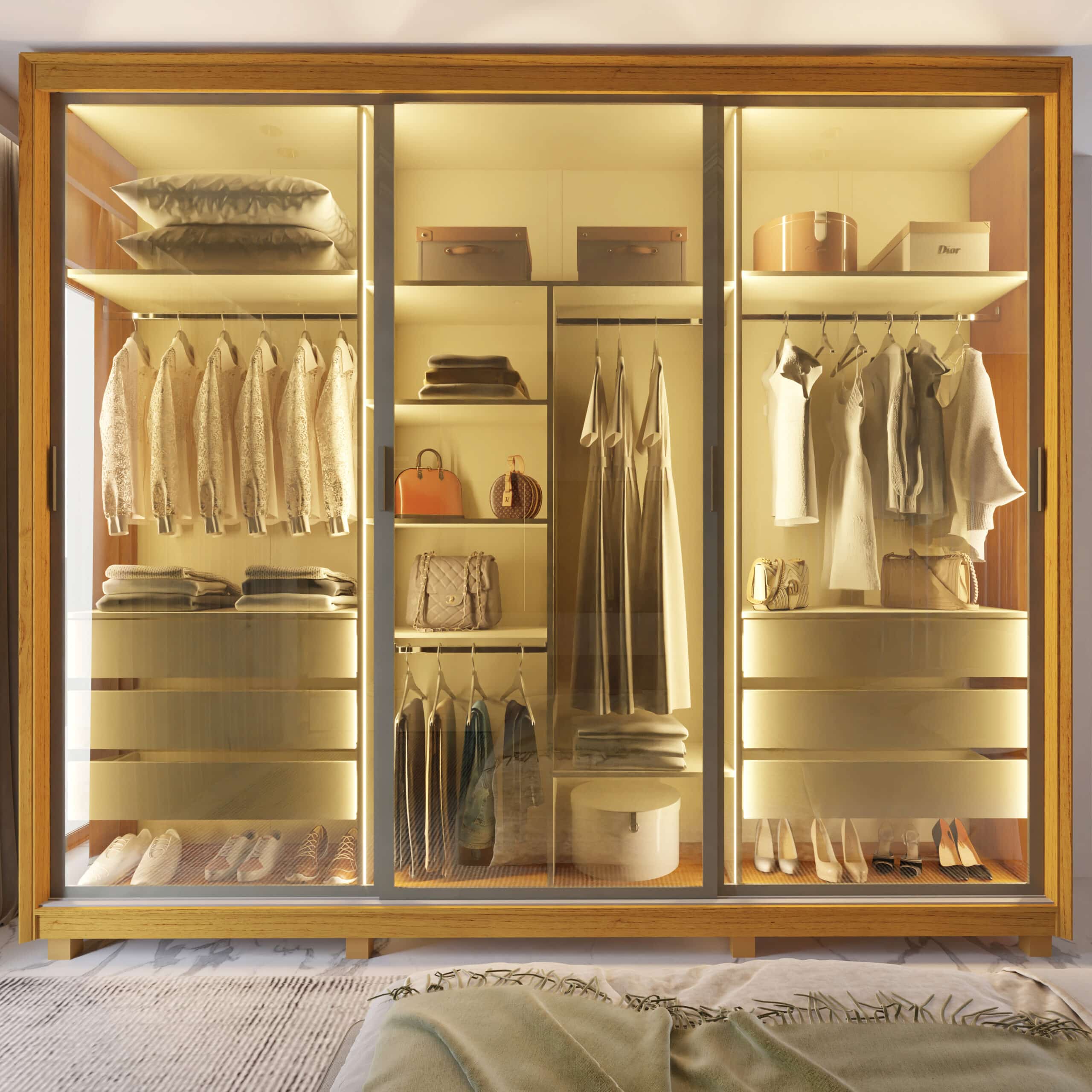 O luxo que muda o quarto por completo! Um roupeiro imponente, moderno e funcional, com acabamento premium e iluminação quente que valoriza cada detalhe do ambiente. 🛏️💎